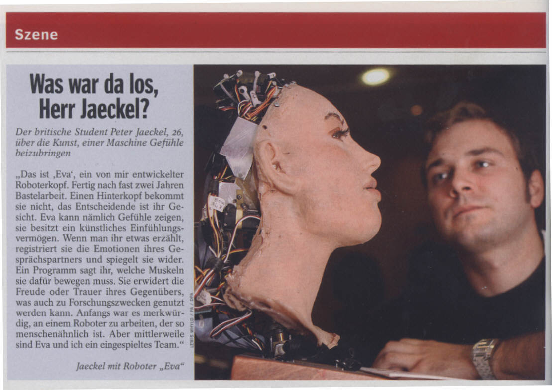 Dieser Robotterkopf wurde von einem englischen Studenten namens Jaeckel entwickelt. Er ist in der Lage die Emotionen seines menschlichen Gegenübers zu erkennen und darauf zu reagieren. Also gewissermassen eine Nachahmung der Spiegelneuronen im Gehirn.