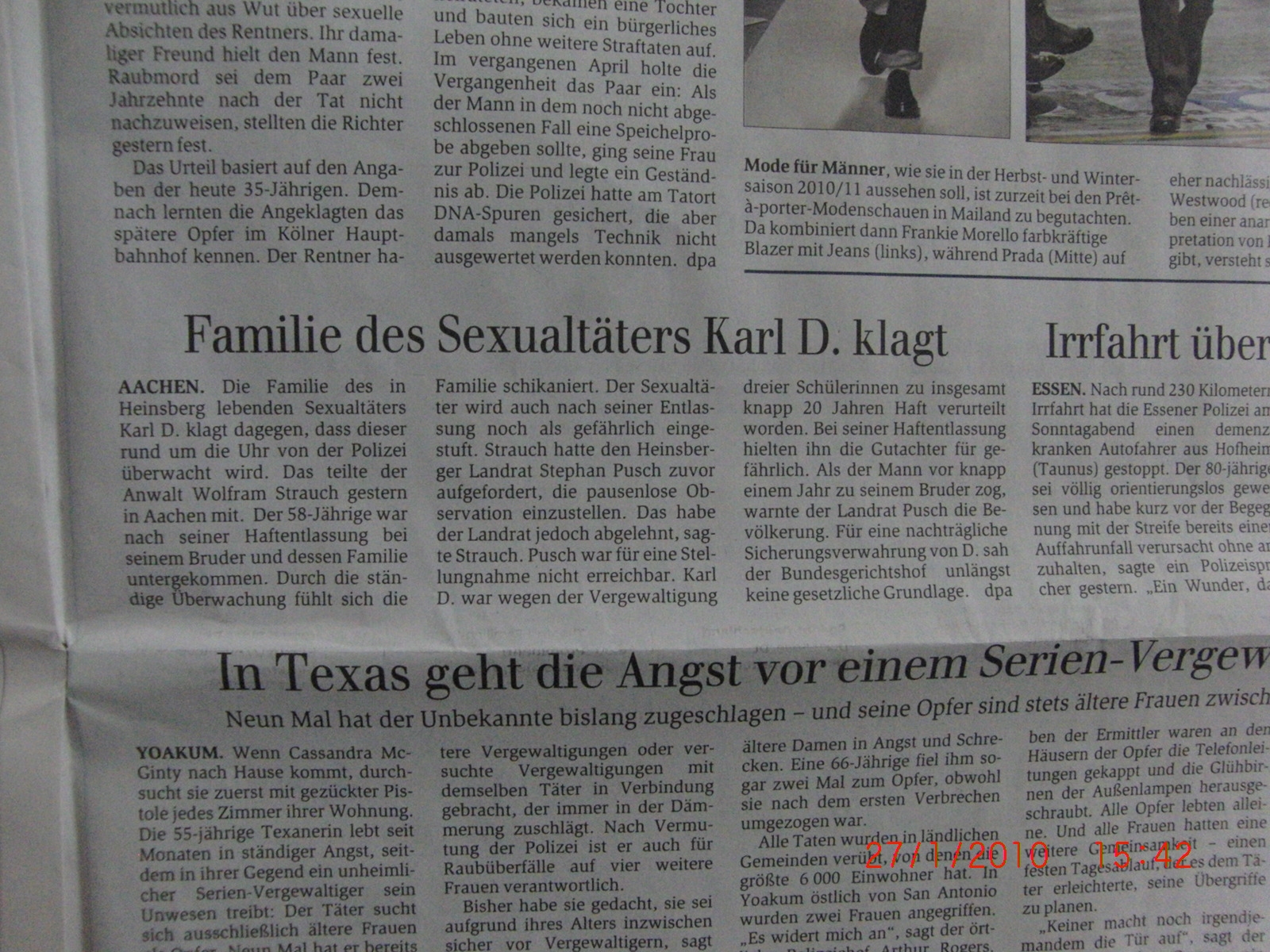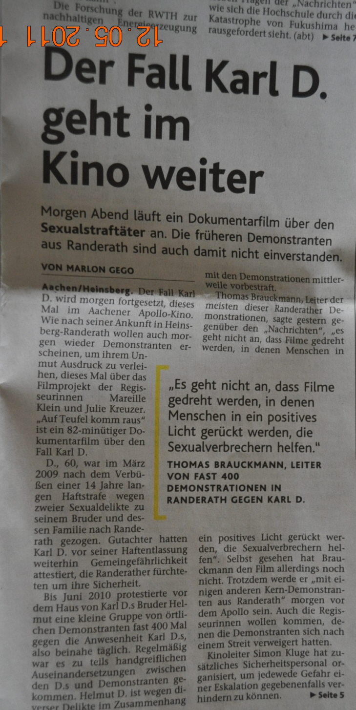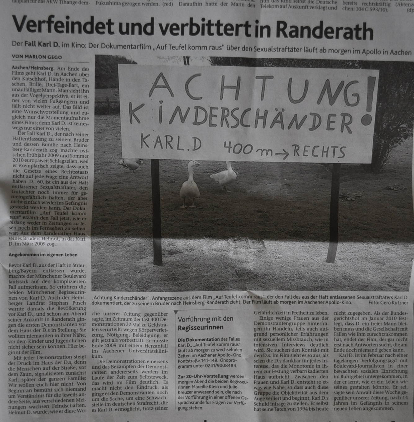 Neues zu Karl D. Karl D. wurde inzwischen verfilmt, allerdings habe ich ernste Zweifel, ob an diesem Fall alles so ist, wie es dargestellt wird, schon allein die BEIDEN UNTERSCHIEDLICHEN ÖFFENTLICH aufgehängten Täterfotos lassen darauf schließen, dass hier einiges nicht stimmt. Da wird wohl versucht, einiges auf andere und wohl falsche Personen zu projizieren. Passende Geschichte unter Mobbing, “Äh komm loss ens en Faceboooock fälsche hä”. Presseschau Karl D 12. Mai 2011 Eins und Zwei Zur Erinnerung hier noch einmal der Fall des Kindermörders Jürgen Bartsch bei dem allerdings eine klare Beweislage vorhanden war. Wäre in den 60ér Jahren der Fall eines nachgewiesenen Kindermörders oder der Kannibale von Rothenburg verfilmt worden, die Bevölkerung hätte die Kinos in Brand gesteckt.