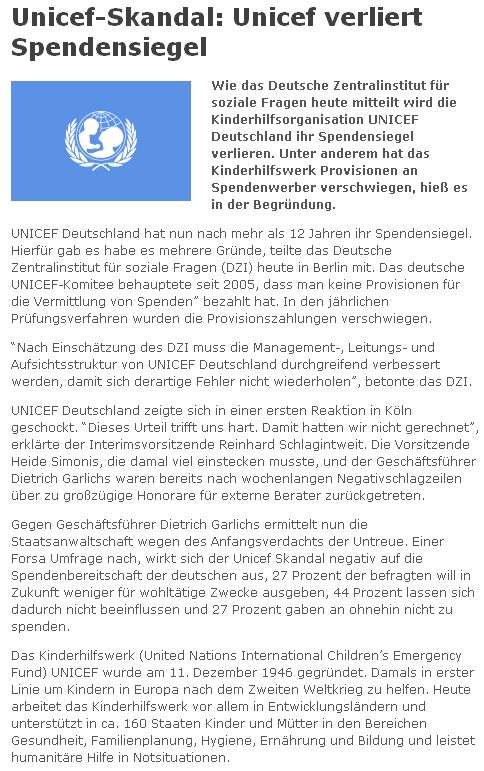 www.charitywatch.de (inzwischen muss ich die Seite Charity Watch etwas kritischer einschätzen, da der Betreiber dieser Seite mit seinen Ansprüchen offenbar überfordert ist, es wurden über Monate Informationen an den Betreiber der Website weitergegen, die aber in keiner Form bearbeitet wurden. Herr Loipfinger hat als freier Journalist für das Manager Magazin gearbeitet aber nicht, wie teilweise im Internet behauptet wurde, für die Zeitschrift der Spiegel; die Seite Charity Watch war unter anderem interessant, weil bis vor kurzer Zeit auch kritische Fragen zu Charity Watch selber dort nachzulesen waren, die sind inzwischen (Mitte Mai 2011) von der Seite Charity Watch verschwunden; kritsche Fragen und Anmerkungen findet man nun nur noch auf anderen Seiten (noch eine kritische Stimme). Wer Transparenz fordert, selber aber keine Transparenz liefert, sondern kritische Beiträge (die aber vom Inhalt her nicht zu beanstanden waren, dass heisst diese Beiträge waren weder unhöflich noch aggressiv sondern bezogen sich auf die Transparenz der Mittelverwendung von Charity Watch selber) löscht, den sehe ich skeptisch. Es ist immer gut auch die Arbeit und die Motive von (angeblich) kritischen Angeboten zu hinterfragen.